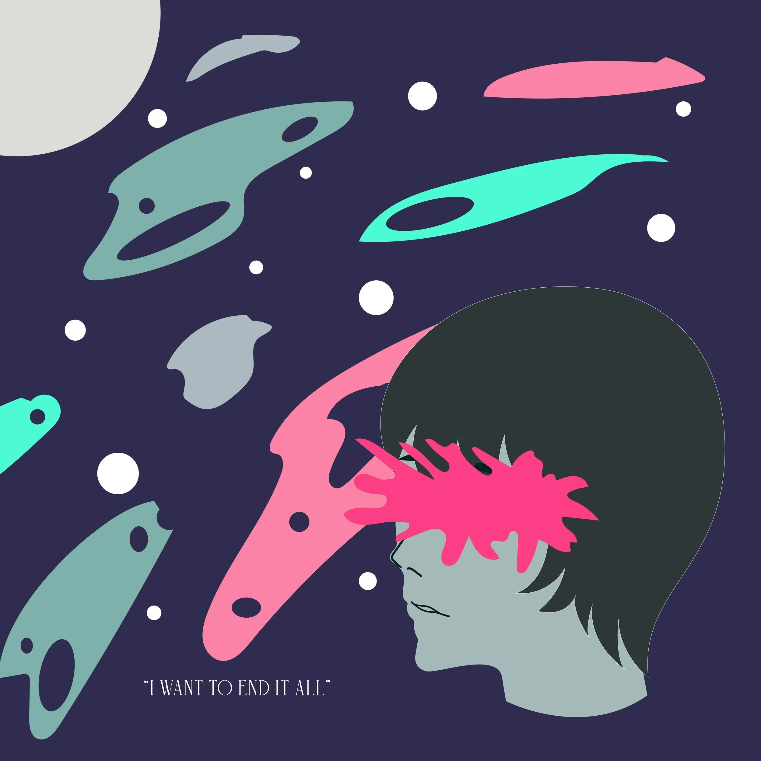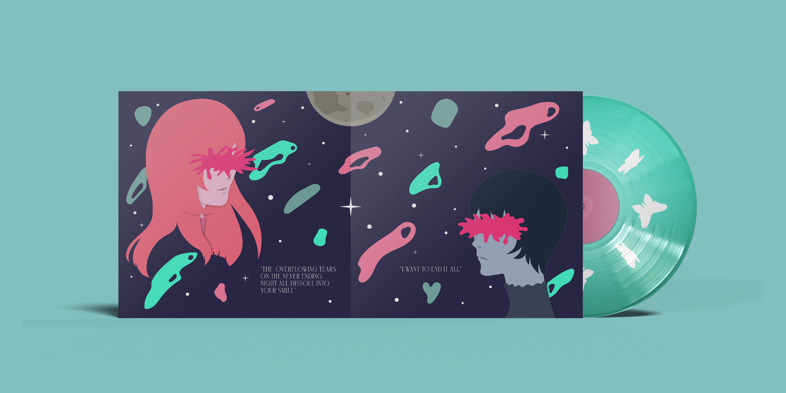 The two figures are portrayed with a dark background, resembling outer space, as splotches of color travel through. Depicting the significance of falling into the night sky as the two characters long for each other romantically, but their demise drags them down.