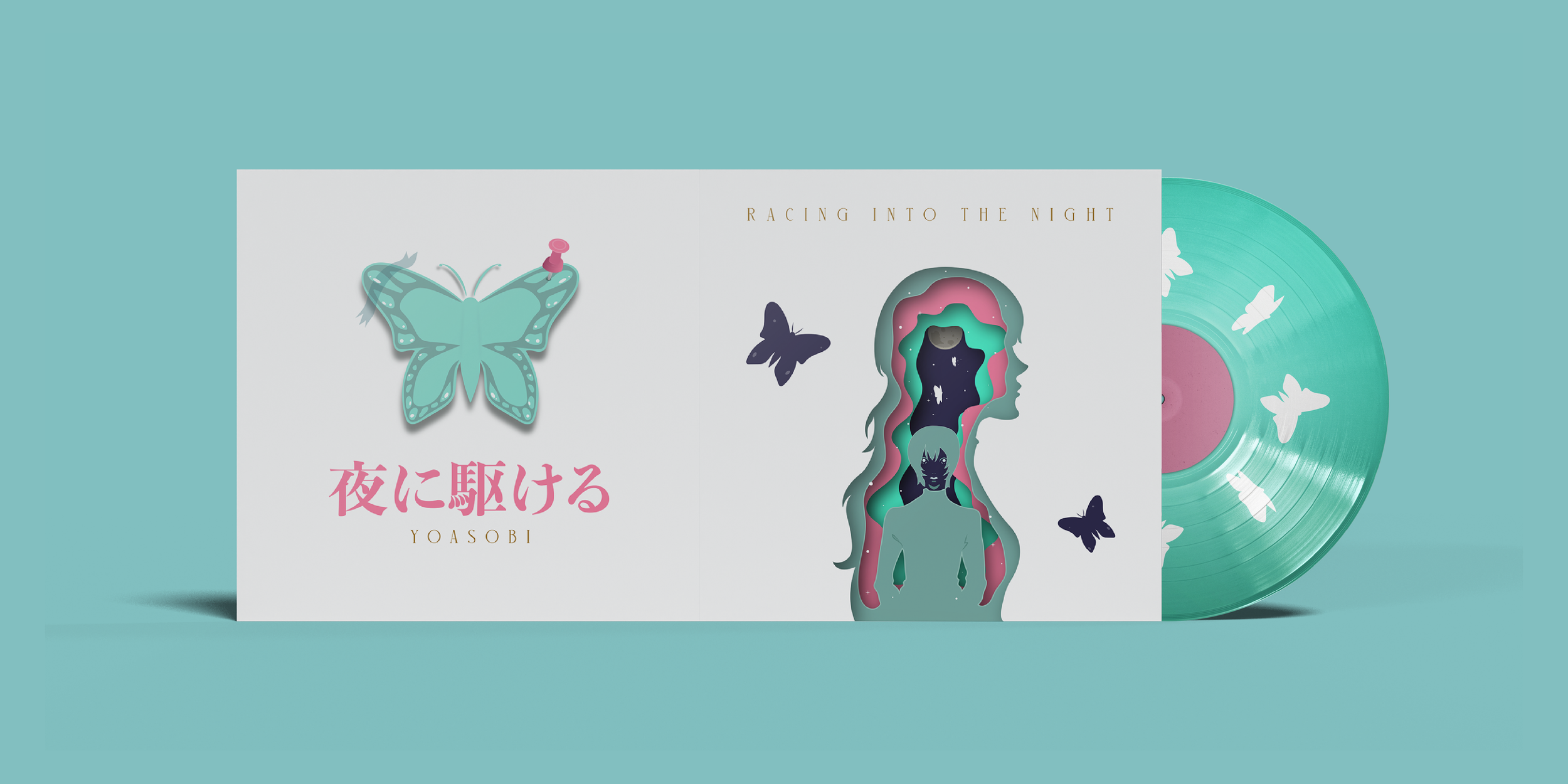 The front cover depicts both the major protagonists from the chosen song's music video, as well as butterflies representing the characters after they've sped into the night, as the song title states. Following the same metaphorical theme, I chose a butterfly being pinned down as the back cover.